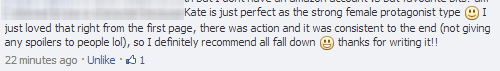 I’m relieved that the main character, Kate, has come across so well. I put a lot of effort into writing Kate, and it was very important to me to have a strong female protagonist; science fiction is often lacking in these.