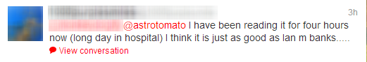 The comments about Kate are reflected by another reader who compared the book to Iain M. Banks’ work. The first comment comes from their experience part way through the book: